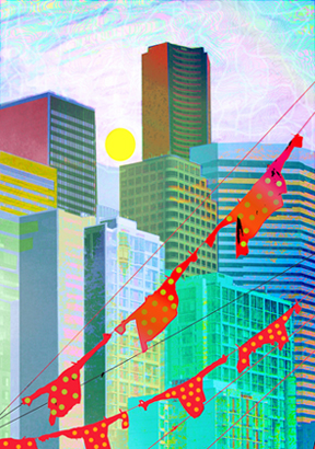 This piece is named "Urban laundry" by Rod Whyte. Rod creates his art by using photo manipulation, painting and drawing. He also loves to use color and transparency. I admire this piece very much. I think its genius. As a New Yorker I appreciate this piece because it captivates the essence of the inner city appearance.